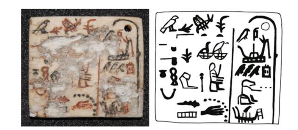 Ivory label of Semerkhet, Dynasty One, Abydos. Image of Babi the Baboon seated under three hawks - bottom right.